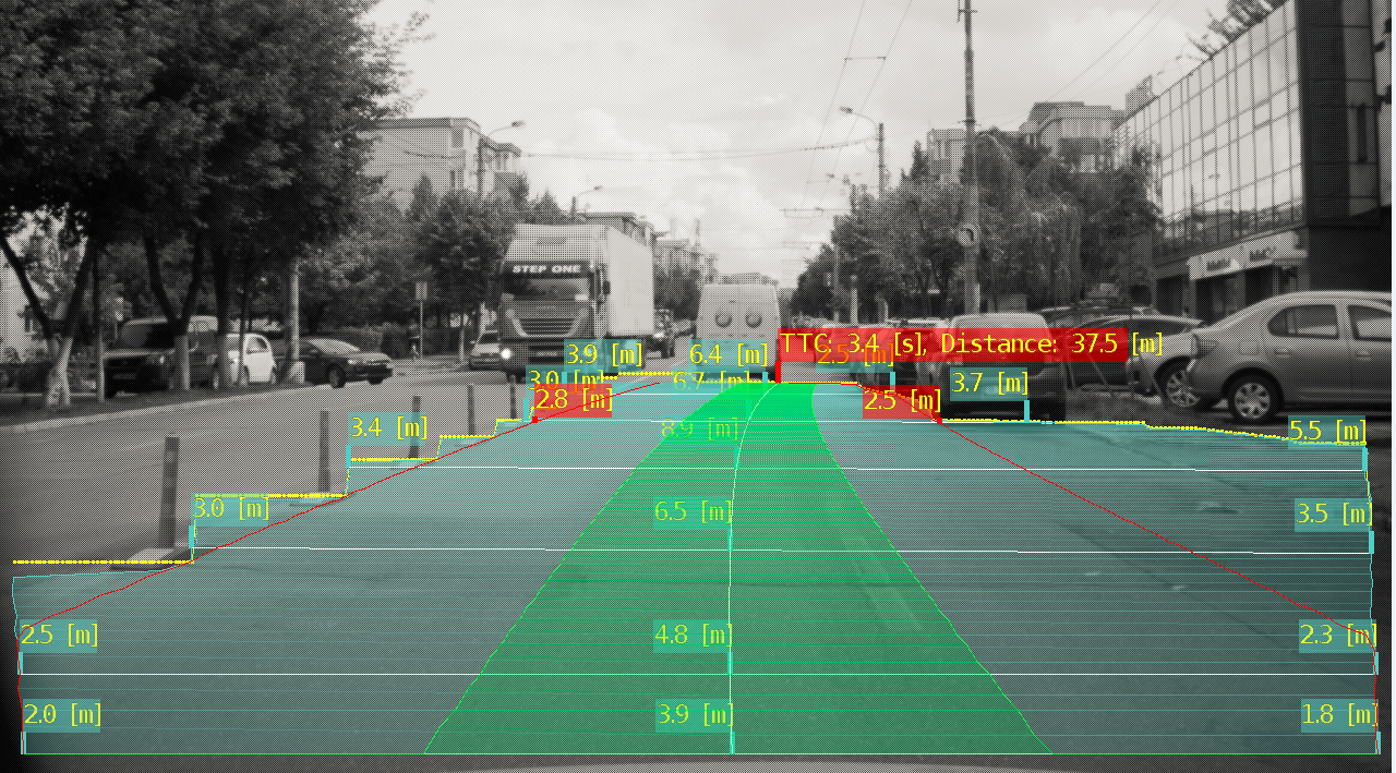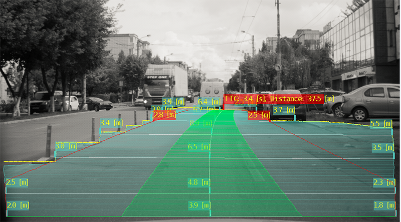 Având o astfel de hartă de disparitate și reconstrucția 3D corespunzătoare acesteia, provocarea algoritmică devine detectarea de entități 3D din această reprezentare. Un astfel de exemplu este spațiul 3D liber (Figura 9), care este un poligon având vârfurile pe drum și reprezentând zona delimitată de orice fel de obiecte 3D. În cazul conducerii automate, spațiul de manevră se obține prin fuzionarea informațiilor de la senzori video cu alți senzori (RADAR, LiDAR) și cu informații din hărți precise, pentru un grad ridicat de robustețe a măsurătorilor.