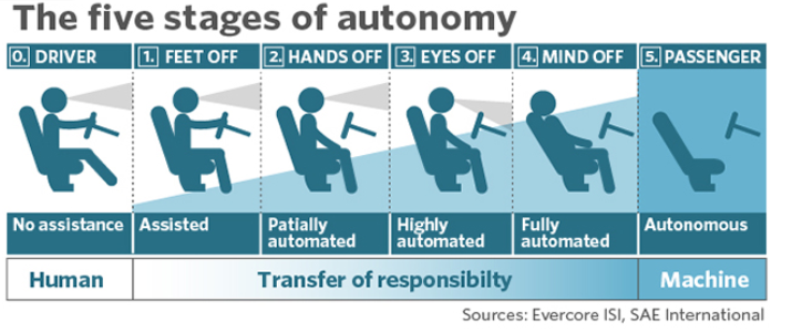 În funcție de capabilitățile de percepție și de luare a deciziilor, sistemele de conducere automată au fost clasificate (Figura 3) de la nivel 0 (fără automatizare) până la nivel 5 (fără conducător auto). Găsesc sugestive și ușor de înțeles terminologiile "hands off" (nivel 2), "eyes off" (nivel 3) și "mind off" (nivel 4).
