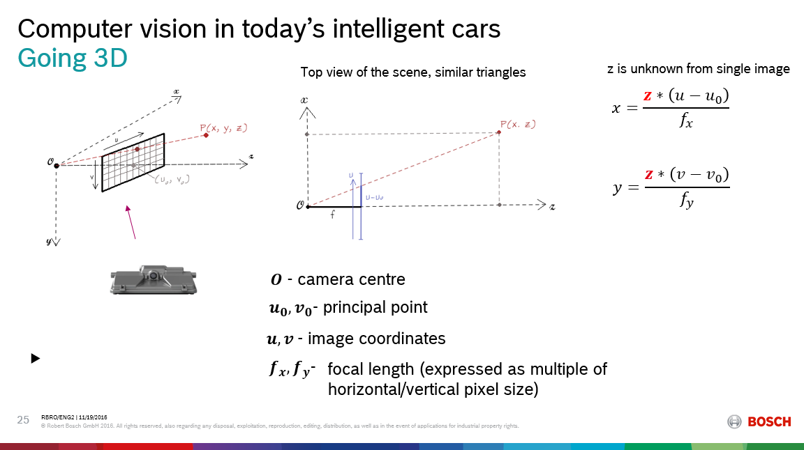 Ce presupune aceasta? Practic după "câteva" etape de pre-procesare (ex: eliminarea distorsiunilor lentilelor) achiziția unei imagini poate fi modelată geometric ca o proiecție perspectivă. Un punct 3D (indicat cu albastru în Figura 6) este proiectat în planul imagine (indicat cu verde în Figura 6) unind punctul 3D cu centrul de proiecție (O în Figura 6). Astfel, dacă punctul P este un punct 3D de pe culoarea roșie a unei lumini de frână, atunci acesta va fi proiectat într-un pixel roșu; dacă punctul 3D este pe culoarea galbenă a unui semnalizator de schimbare de direcție, atunci acesta va fi proiectat într-un pixel galben; dacă punctul P este un punct 3D pe un marcaj rutier (banda de mers, trecere de pieton, săgeți etc.), atunci proiecția va fi un pixel alb.