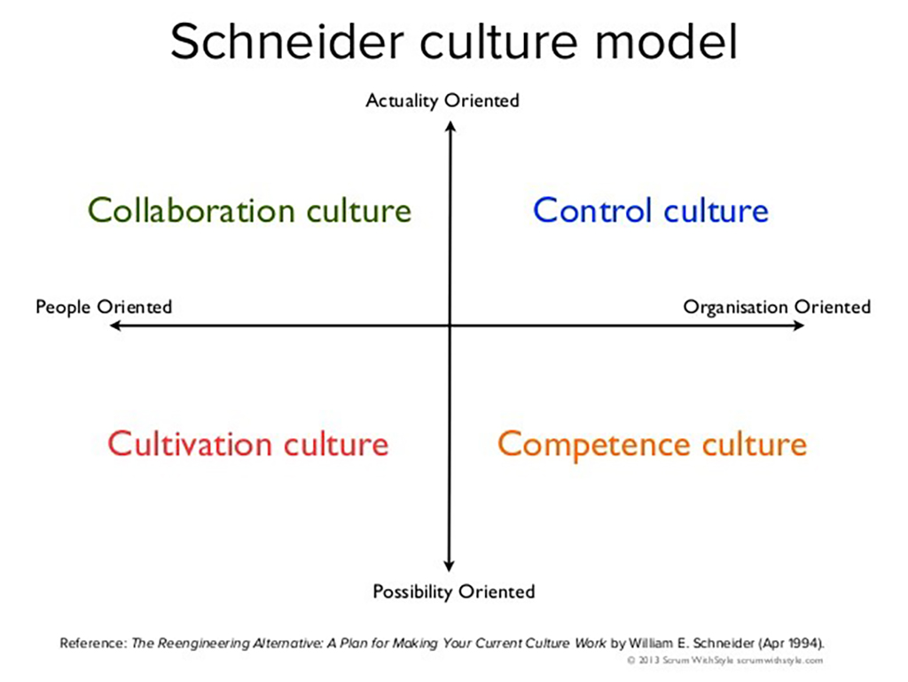 Schneider evaluează cultura organizațională pe baza a două dimensiuni: în plan personal (oameni vs. organizație) și din punct de vedere al realității (realitate vs. potențial).