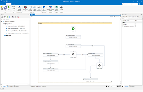 Abordarea, din punctul de vedere al tehnologiei în UiPath, se bazează pe .Net și Windows Workflow Foundation și constă dintr-un design vizual, o serie de layouturi (Sequence, Flowchart, State Machine), în care pot fi conectate un set de activități specializate (extensibil, adică un set oficial de bază și posibilitatea de a adăuga activități noi) care asigură tipuri comune de operații, integrări cu diverse platforme, aplicații sau alte tehnologii, majoritatea având posibilități de interacțiune cu elemente vizuale din web browsere sau aplicații desktop.