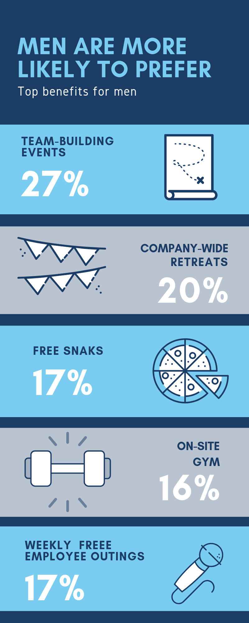 Al doilea motiv important pentru care aceste beneficii nu funcţionează la capacitatea la care am vrea noi sunt diferențele de gen. Există o diferență destul de mare între ceea ce preferă femeile și ceea ce preferă bărbații. Aceștia din urmă preferă activități de team building în natură, cu colegii, în timp ce majoritatea femeilor preferă abonamentele gratuite la fitness. În plus, pentru femei, partea de concediu este mai importantă și mai de dorit decât pentru bărbați. Spre exemplu, acestea ar aprecia mai mult un concediu prelungit în detrimentul unor gustări la birou. Un studiu realizat de PricewaterhouseCoopers ne arată că 32% dintre femei preferă o asigurare medicală comparativ cu 24% dintre bărbații, în schimb când a venit vorba achiziționarea unei mașini, bărbații au fost cei mai mulți care au optat pentru această variantă.