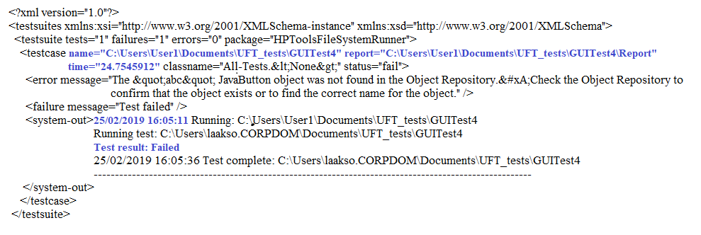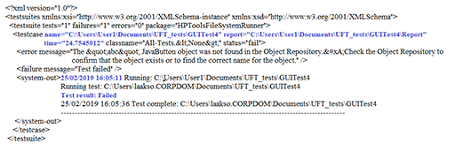 Tot în acest workspace este copiat și executabilul. Pentru fișierul rezultat, datele sunt colectate fie din results.xml sau run_results.xml, ambele generate de către UFT (results.xml pentru RunResultsViewer și run_results.xml pentru raportul HTML).