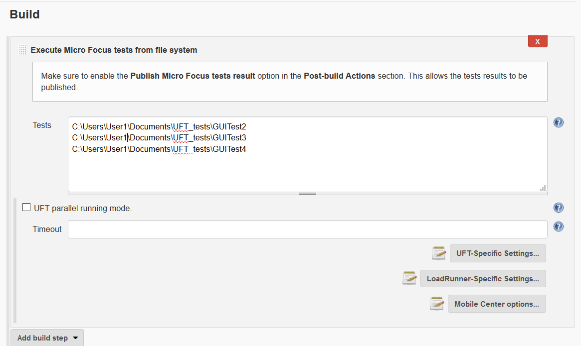 2. Alegerea tipului de task : Execute Micro Focus tests from file system (Build -> Add build step) ;