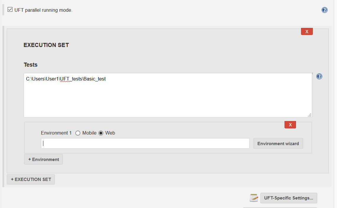 Când este configurat, fiecare test este executat secvențial. În timpul executării fiecărui test, environmenturile multiple sunt testate în paralel. Pentru aceasta opțiune se alege la build step ca tip de task "Execute Micro Focus tests from file system" și se selectează opțiunea "UFT parallel running mode". După aceasta, se definesc testele și environmenturile paralele.