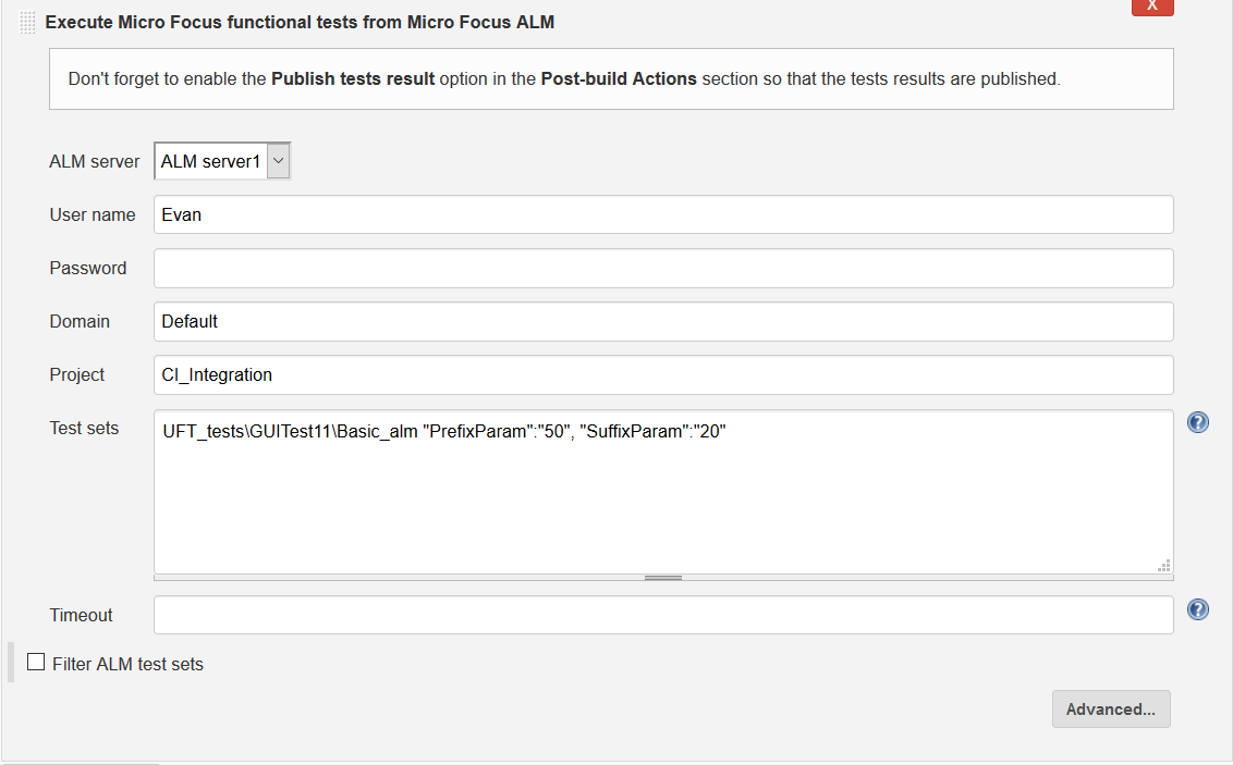 Completați formul cu toate informațiile necesitate de ALM, printre care cele importante sunt: serverul (preconfigurat anterior Jenkins -> Manage Jenkins -> Configure system), credențialele, domeniul și proiectul.