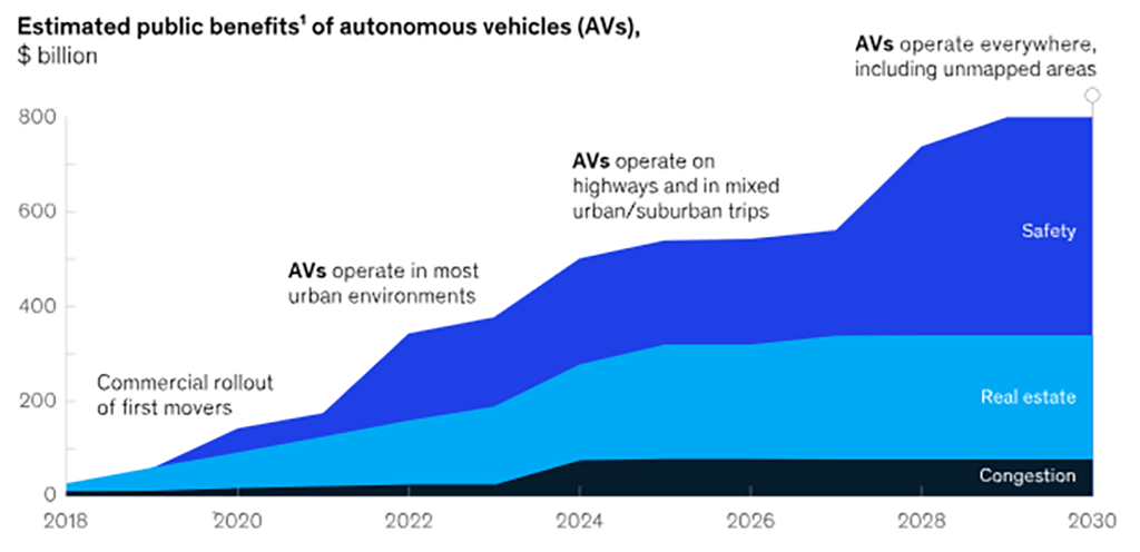 Dacă Statele Unite, de exemplu, ar adopta pe deplin vehicule autonome, beneficiul pentru public ar depăși 800 de miliarde de dolari pe an în 2030. Aproape o treime din beneficiu ar rezulta din reabilitarea sectorului public prin modificarea spațiilor destinate parcării și transformarea acestora în spații cu destinație comercială sau rezidențială. Aproximativ 15% s-ar acumula anual prin utilizarea productivă a timpului în cazul celor care fac naveta spre locul de muncă. Mai mult, se anticipează un beneficiu anual de aproximativ 0.5% prin diminuarea daunelor asupra mediului. În cele din urmă, mai mult de jumătate din beneficiile obținute ar proveni din căi rutiere mai sigure prin evitarea a milioane de accidente cauzate în fiecare an de erori umane.