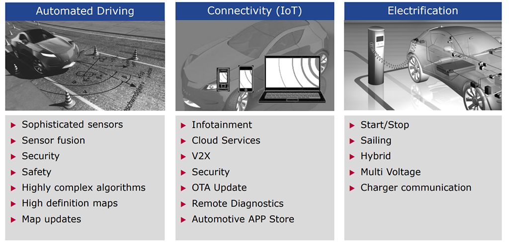 În următorii ani, dezvoltarea zonei de E/E (Electric/Electronic) va fi influențată în mare măsură de tendințe cum ar fi: conectivitatea, electrificarea și conducere automată. Use case-urile introduse de aceste tendințe vor avea beneficii atât pentru clienți, cât și pentru OEM(Original Equipment Manufacturer).