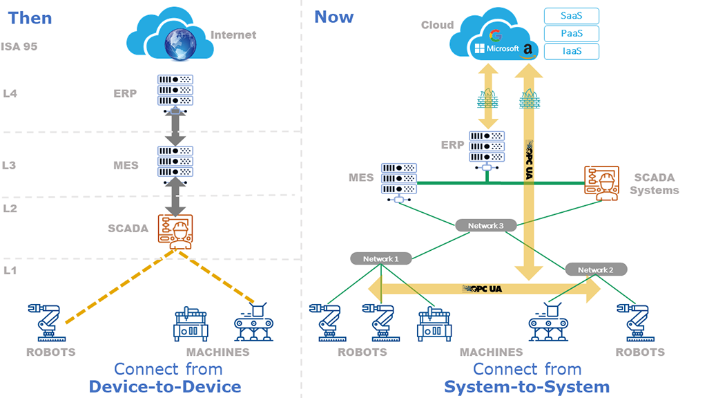 Până în prezent standardul internațional ISA95 - ce descrie o ierarhie de interconectare între diversele sisteme folosite de companii (PLC, SCADA, MES, ERP), a reprezentat un model viabil, dar acest lucru se va schimba odată cu noile cerințe. Acest standard are o implementare ierarhică, dezvoltată pe verticală, caracteristici care conduc la o constrângere a fluxului de date în raport cu performanțele și disponibilitatea sistemelor implicate. Conceptul de fabrică digitală presupune o disponibilitate a datelor și un acces direct, fără intermediari, la acestea pentru toate sistemele componente. Se face astfel trecerea de la o comunicare "liniară" la una "paralelă" unde o platforma digitală oferă acces la toate datele generate de mașinile și sistemele prezente în companie. În imaginea alăturată este prezentat fluxul de date și diferențele dintre cele două modele.