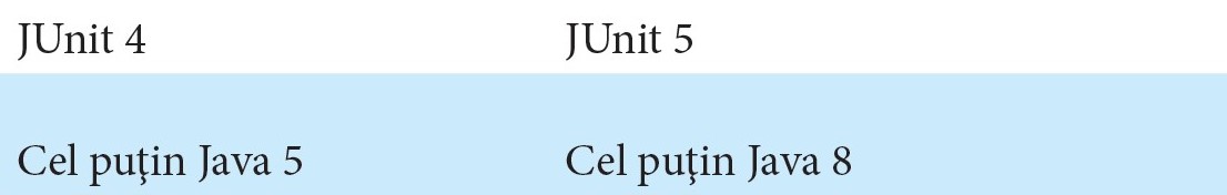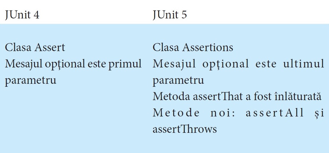 Comparaţia între assertions în JUnit 4 şi JUnit 5 arată astfel: