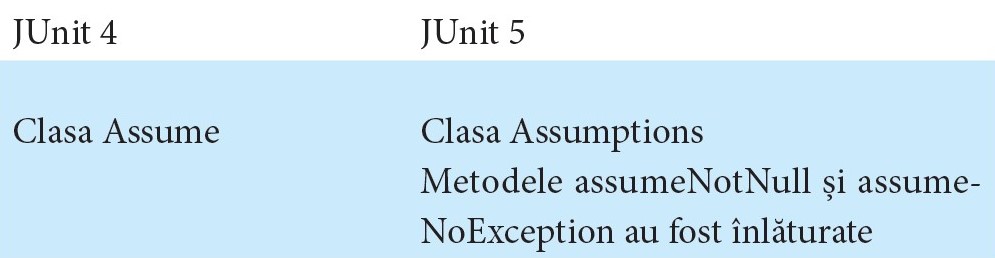 O comparaţie între assumptions în JUnit 4 şi JUnit 5 se prezintă în această formă: