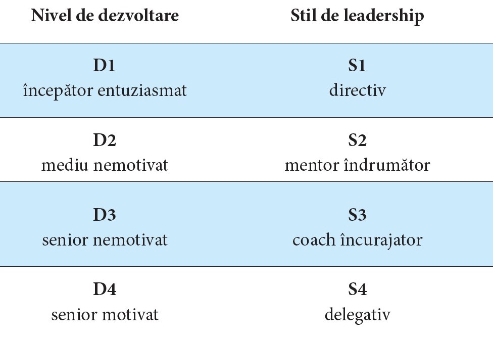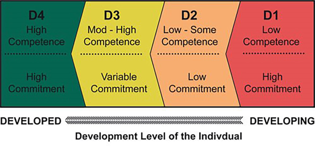 Pentru a înțelege de ce avem nevoie de diversele tipuri de leadership, Blanchard împarte dezvoltarea omului într-un anumit domeniu în patru niveluri diferite: