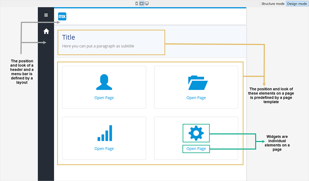 O pagină este o interfață end-user în aplicațiile Mendix. Paginile se pot crea, edita și manipula din Page editor.