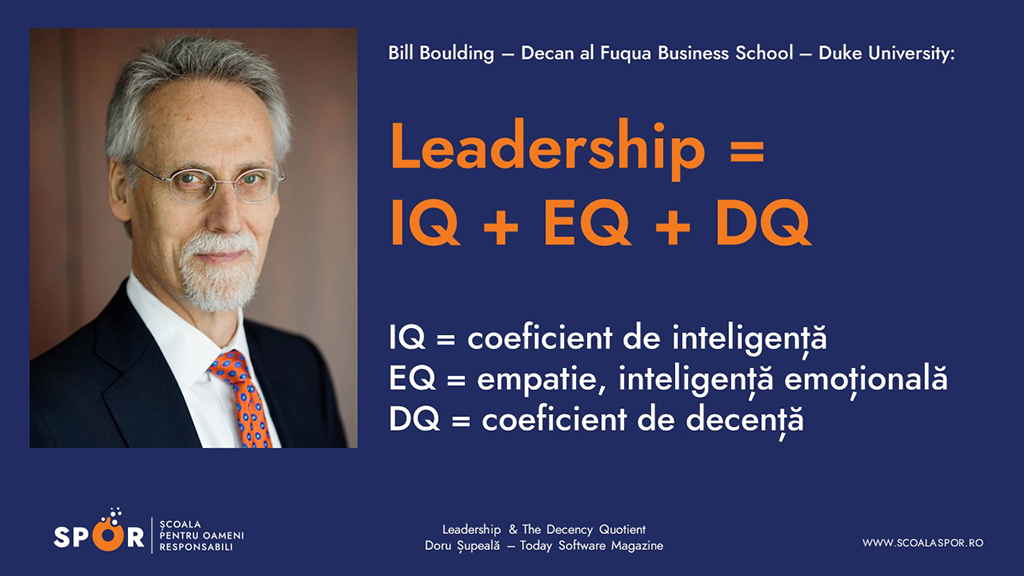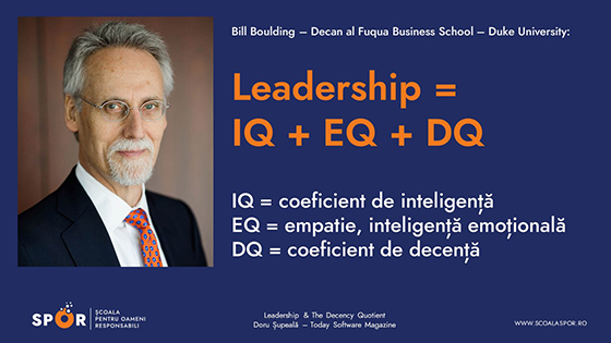 Bill Boulding, decanul facultății de business de la Duke University, a scris recent un articol devenit viral în Harvard Business Review, în care spune că, dincolo de IQ și EQ (inteligență cognitivă și empatie, adică inteligență emoțională), liderii veritabili și de mare calitate ai organizațiilor trebuie să demonstreze Decență, adică o sumă consistentă de integritate, responsabilitate, generozitate, modestie, moralitate, cinste, orientare sinceră către ceilalți și respect real pentru societate și mediu.