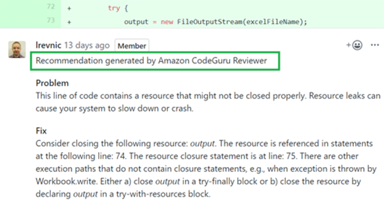 CodeGuru Reviewer - După cum sugerează și numele, este un serviciu pentru code review automat. Acesta scanează codul sursă și identifică problemele de cod înainte ca acestea să fie incluse în produs. Pe lângă aceasta, CodeGuru Reviewer adaugă și sugestii de fixare a problemelor. De exemplu, la crearea unui pull request în GitHub, CodeGuru Reviewer poate analiza codul și adăuga comentarii cu sugestii de îmbunătățire. În prezent, acest serviciu suportă GitHub și poate scana cod sursă scris în limbajul de programare Java. Costul este de \$0.75 / 100 de linii de cod și există și o versiune trial de 90 de zile pentru cei care doresc să-l încerce.