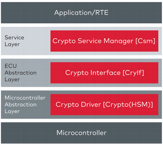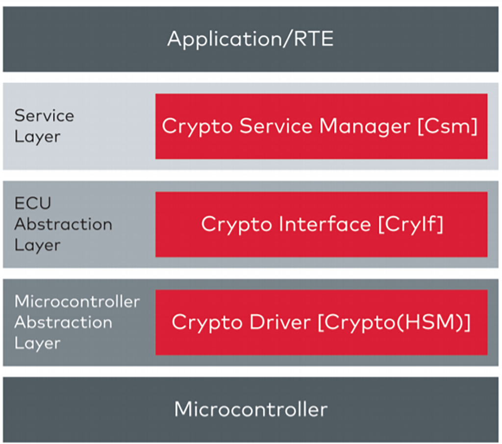 Arhitectura AUTOSAR a standardizat un stack pentru operațiile de criptare pentru a defini interfețe standard de acces. În acest mod s-a creat contextul de a accesa librării software sau HSM.