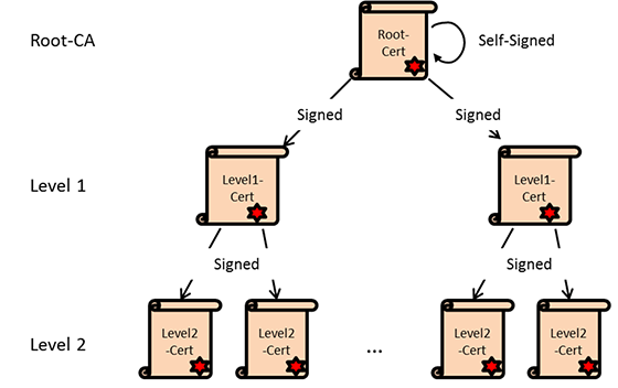Se utilizează un sistem de tip PKI (sistem ierarhic de certificate de tip tree based; root certificate-ul constituie aşa numitul "root anchor"). Ulterior, mai multe certificate sunt derivate pentru diferite funcţii. Funcţionează în felul următor: certificatul din root este autosemnat (cheia privată aparţine autorului care este extern) apoi sunt semnate certificatele de la nivelul următor, folosind cheia privată a instanţei părinte de mai sus. Cheile, de cele mai multe ori, sunt de tip asimetric iar sistemul conține şi o listă prin care poate să anuleze anumite certificate. Acestea fie nu mai sunt utilizate, fie au cheia privată compromisă.