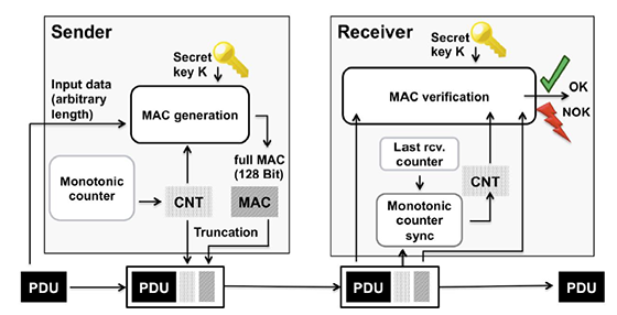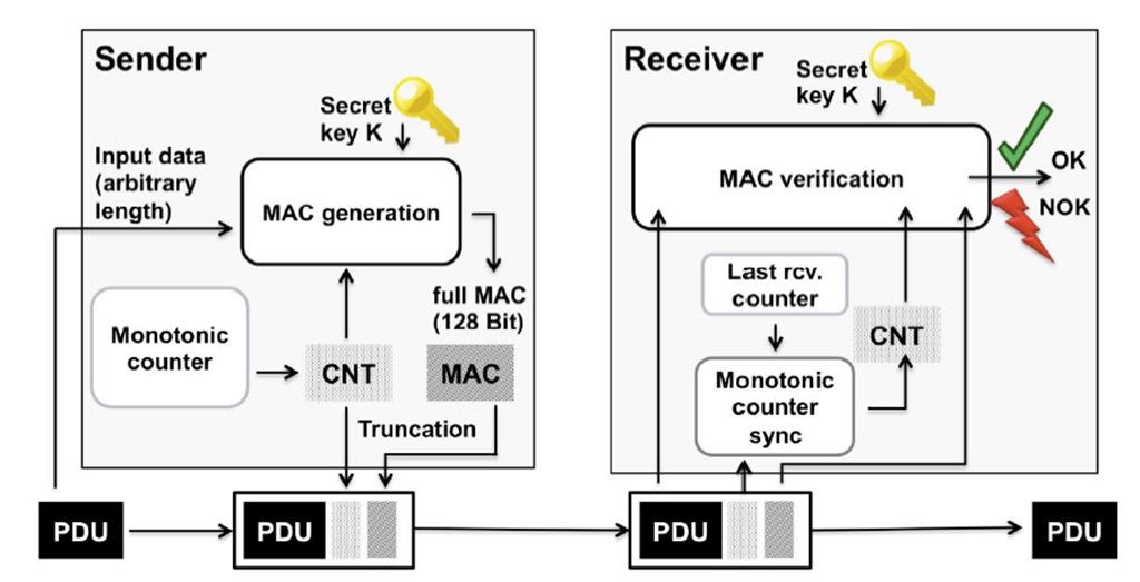 De exemplu: modulul de SecOC integrează în mesaj (I-PDU), atât pe partea senderului, cât şi pe cea a receiverului, un "Freshness counter" sau "Timestamp" prin care se verifică dacă mesajul este trimis într-un anumit moment şi nu este injectat în reţeaua de comunicare.