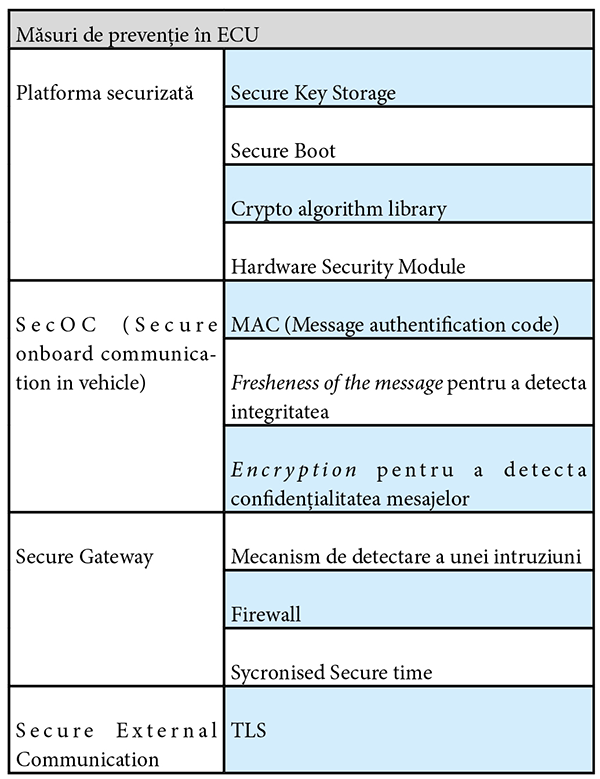 Un proces de criptare are la bază o metodă criptografică care utilizează o cheie de criptare pentru a converti un mesaj simplu într-un mesaj codat, care poate fi apoi convertit înapoi în mesaj simplu utilizând o cheie de decriptare. Printre alţi factori, o cerinţă fundamentală pentru arhitectura de securitate este nedivulgarea și protecţia acestor chei de criptare. Dacă disponibilitatea şi confidenţialitatea cheilor este încălcată, securitatea generală este compromisă. Pentru a combate riscurile atacurilor cibernetice, în industria automotive s-au implementat măsuri specifice de securitate luate din industria tradiţională IT - conceptul de TLS (Transport Layer Security) şi IPSec (Internet Protocol Security). De exemplu, s-a standardizat în AUTOSAR (standardul arhitecturat general în industria automotive) conceptul de Secure Onboard Communication (SecOC) care implementează măsuri de securitate pentru a proteja comunicarea dintre două ECU-uri din reţeaua maşinii.