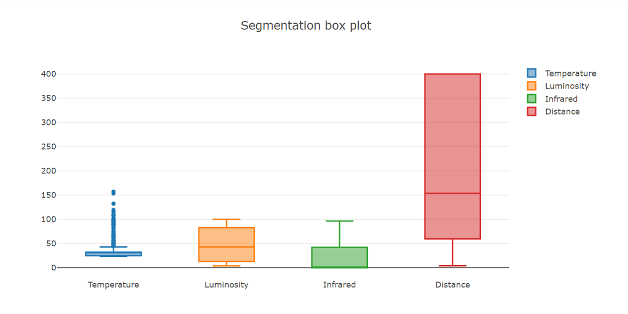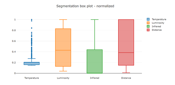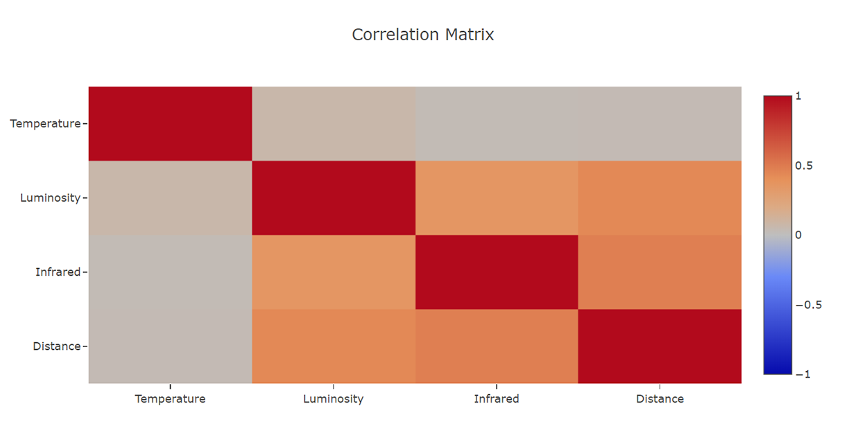 De exemplu, caracteristicile noastre cele mai corelate sunt Distanța și Infraroșu (0,48), iar Temperatura pare să fie cea mai "necorelată" în comparație cu celelalte.
