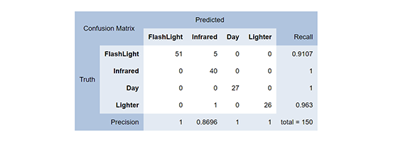 Folosind setul de date de testare putem face predicții și putem compara rezultatele preconizate cu rezultatele reale. În diagrama următoare remarcăm cum clasa Infraroșu a fost prezisă corect (ca Infraroșu) de 40 de ori, a fost prezisă incorect ca FlashLight de 5 ori, și incorect ca Lighter o singură dată, rezultând o rată de precizie de 0,8696.