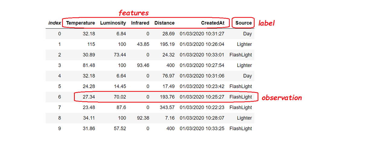 Să presupunem că avem un sistem capabil să măsoare temperatura, luminozitatea, radiația infraroșie și distanța până la o sursă de energie (sursa poate fi o lanternă, o brichetă, lumina ambientală sau o lanternă cu radiație infraroșie). Măsurătorile se fac cu ajutorul unor senzori conectați la un dispozitiv IoT (Raspberry Pi 3) și avem un set de date format din câteva sute de observații. Aceste observații sunt etichetate, ceea ce înseamnă că avem sursa fiecărei observații din setul de date. Cu alte cuvinte, vrem să prezicem sursa pentru fiecare nouă observație.