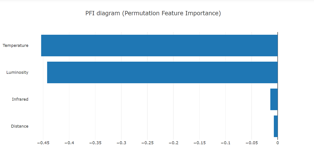 Un alt instrument util este diagrama PFI (Permutation Feature Importance). PFI calculează scorul de importanță pentru fiecare dintre coloane (măsurători) prin permutări aleatorii ale funcției, rezultând că unele caracteristici sunt mai mult sau mai puțin importante.