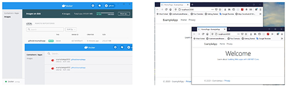Vom șterge, însă, acum din Docker imaginea și containerul create automat atunci când am rulat aplicația, apoi, le vom recrea din linia de comandă. Pentru a înțelege cum se creează imaginile și containerele folosind linia de comandă din folderul ExampleApp, rulați următoarele comenzi în consolă, în urma cărora se vor crea imaginea cu aplicația și două containere pe baza ei, -p fiind o mapare a portului 80 din containere la portul 3000 respectiv, 4000 din sistemul host, iar -t este tagul asociat cu imaginea, o convenție fiind ca eticheta să fie de forma CompanyName/AppName: