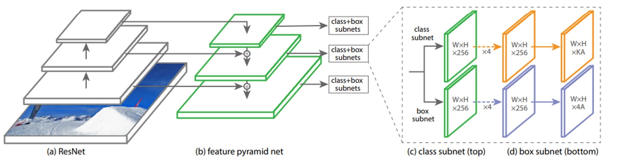 Din punct de vedere arhitectural Retinanet face parte din clasa de detectoare care construiesc un modul de detecție "deasupra" unei rețele neuronale convolutive convenționale. În experiența mea, am folosit ca arhitectură primară rețeaua ResNet [5], în special varianta ResNet-50. Modulul RetinaNet se compune dintr-o rețea piramidală de caracteristici (Feature Pyramid Network) din ale cărei câteva nivele (de obicei, ultimele 5) ies sub-rețele care se specializează pe localizare și clasificare (Fig. 1).