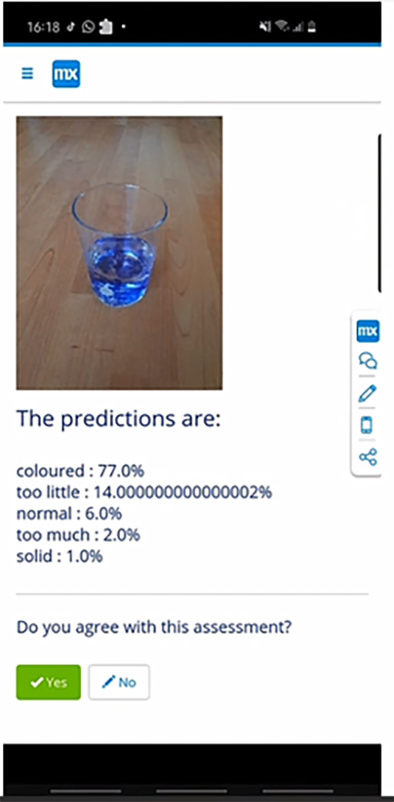 Algoritmul a fost testat pe un set de imagini care conțin recipiente cu lichid, cu scopul de a identifica puritatea compoziției. Algoritmul a fost antrenat pentru a grupa imaginile în cinci categorii: colorat (dacă lichidul are o culoare diferită decât targetul), solid (dacă lichidul are impurități), normal (acesta este rezultatul așteptat), prea mult (nivelul lichidului este mai mare decât targetul), prea puțin (nivelul lichidului este mai mic decât targetul). Noi categorii pot fi adăugate, iar algoritmul poate fi ușor adaptat pentru scenarii diferite.