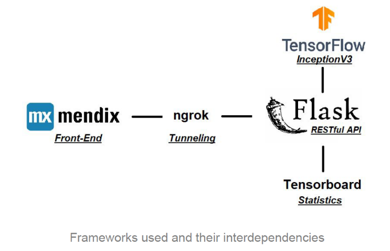 Partea de client a aplicației a fost dezvoltată cu platforma de Low Code, Mendix. Partea de server este implementată în Mendix și Python și folosește algoritmul adecvat de inspecție a imaginilor, existent pe piață pentru scenariul nostru, adică algoritmul InceptionV3 ( librăria Tensor Flow).