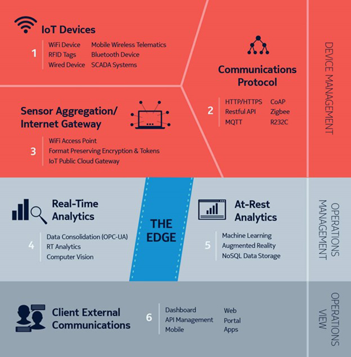 4. Procesare de evenimente și analize în timp real: efectuează analize predictive în timp real și alarmare și facilitează procesarea video. De asemenea, poate efectua consolidarea datelor într-un standard (de exemplu, OPC-UA) pentru a oferi agilitate în proiectarea analitică. Aceste funcții sunt procesate pe o platformă de edge computing.