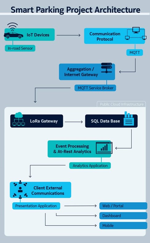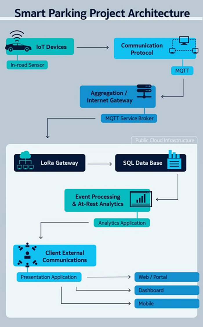 Un sistem de Smart Parking va exemplifica categoriile și deciziile de care trebuie să ținem cont la proiectarea și dezvoltarea unei infrastructure IoT .