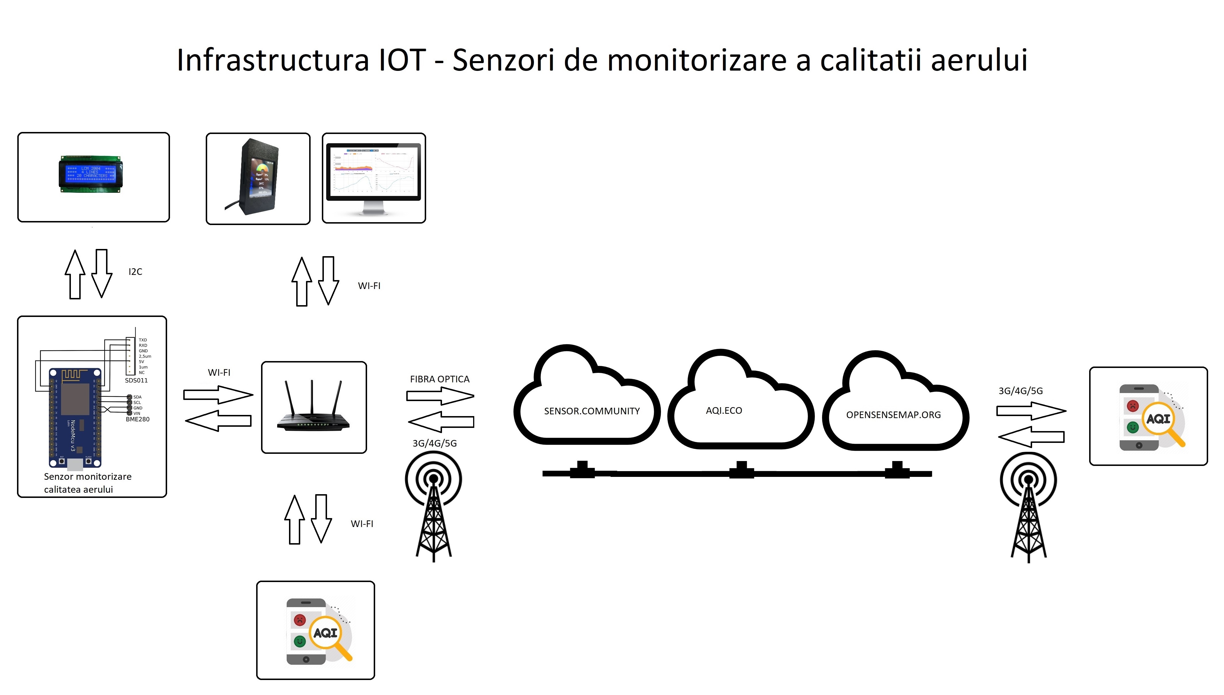 Astfel, local se pot citi date pe un afișor LCD, conectat la procesor prin interfață I2C. Pentru a vizualiza datele de pe dashboardurile aferente fiecărei platforme, utilizatorul va trebui să conecteze la internet laptopul sau alt dispozitiv pentru a avea acces la informații.