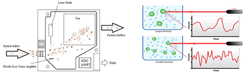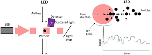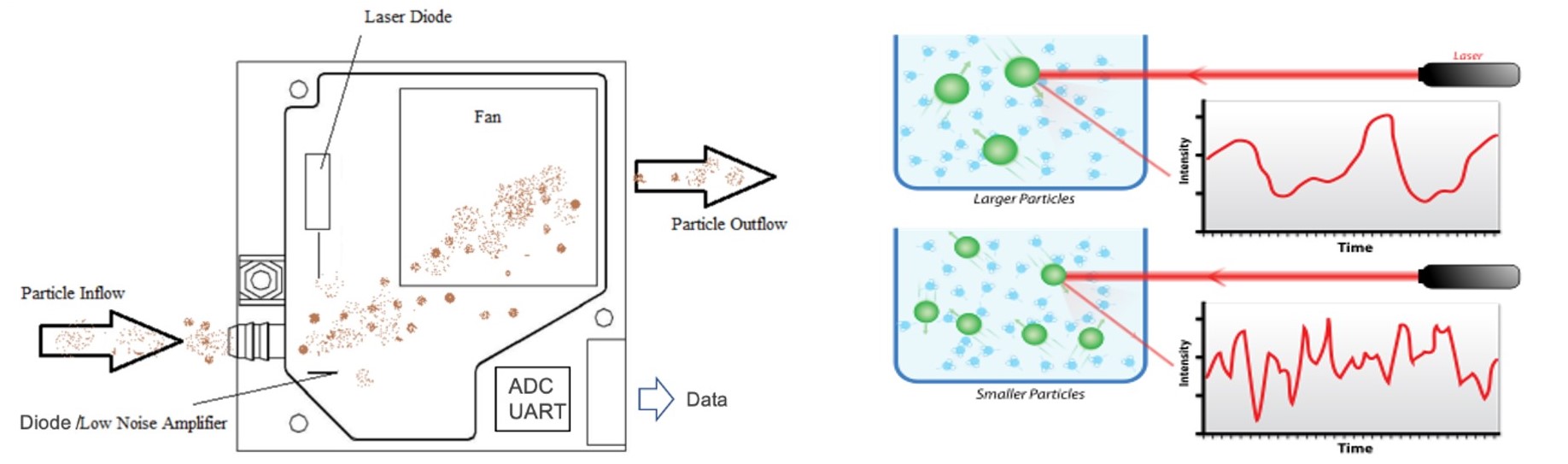 În urma testelor, senzorul SDS011 de la NovaFitness s-a apropiat cel mai mult de cerințele proiectului. Acest senzor măsoară cantitatea de particule PM2.5 și PM10 din aer, utilizând un sistem emițător/receptor de tip LASER. Principiul de funcționare este descris prin imagini după cum urmează: