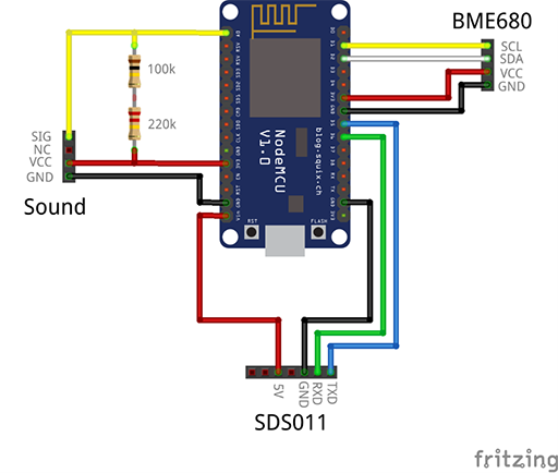 Am început prin a pune laolaltă mai mulți senzori (sds011- senzor ce măsoară particulele în suspensie PM2.5 și PM10, BME680-senzor ce măsoară presiunea, umiditatea și temperatura aerului și un senzor ce măsoară zgomotul sau disconfortul auditiv). Toate aceste componente electronice sunt interconectate cu un procesor care validează și trimite datele în cloud prin intermediul rețelei wireless la care este conectat.