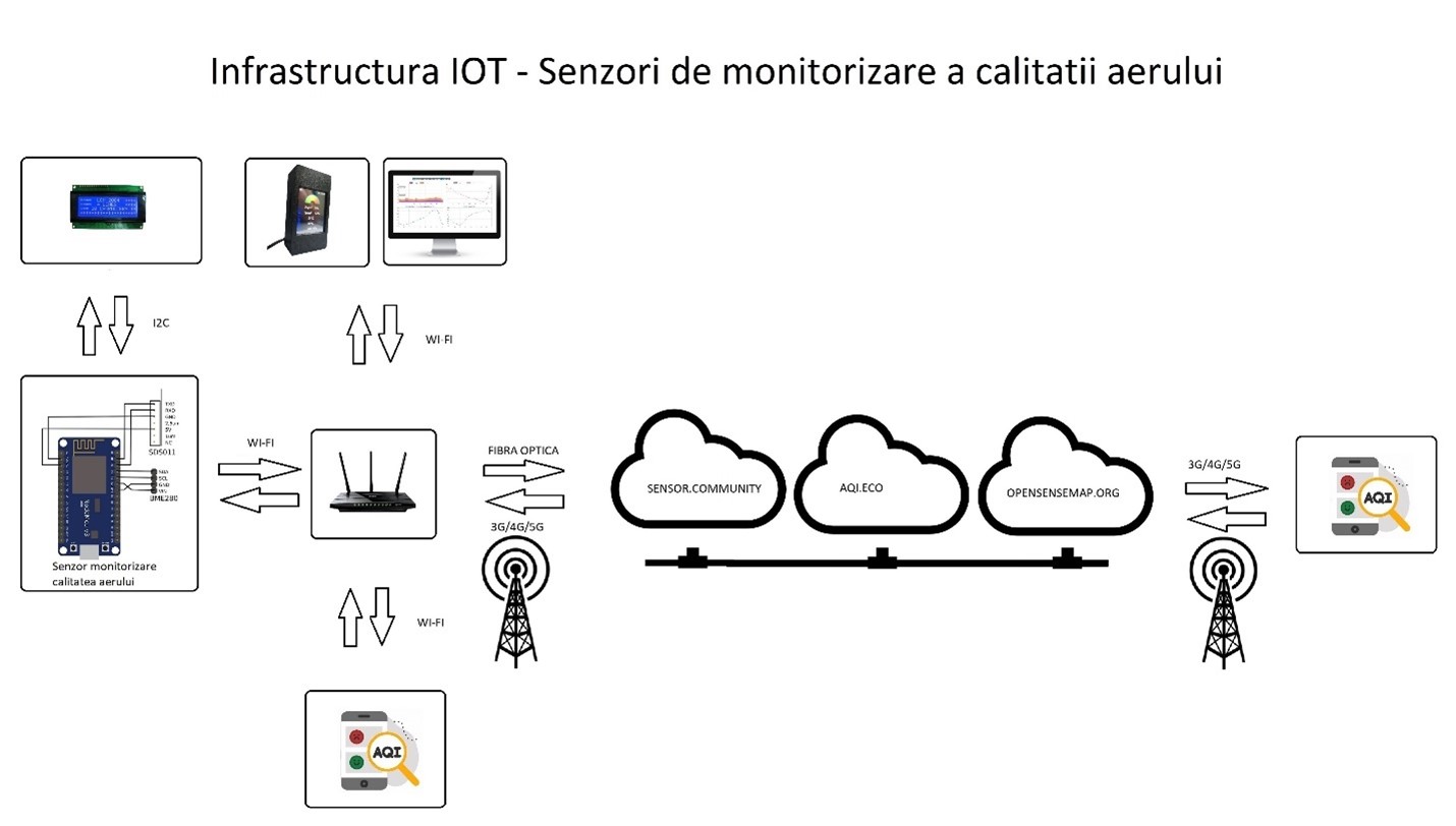 Schema de bază a proiectului inițial a fost relativ simplă. Am utilizat o variantă de software opensource și am căutat să trimitem datele pe platforme dedicate proiectelor de genul acesta: https://pulse.eco/ sau de tip opendata.