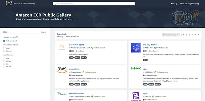 Odată ce imaginea Docker este gata, unde o puteți stoca? AWS Elastic Container Registry (ECR) este serviciul care facilitează stocarea imaginilor compatibile Docker și Open Container Initiative (OCI), atât public, folosind serviciul ECR Public, cât și privat, în ECR Private. Serviciile ECR Public și ECR Private sunt similare, diferența esențială este catalogul ECR Public Gallery care facilitează navigarea printre imaginile publice.