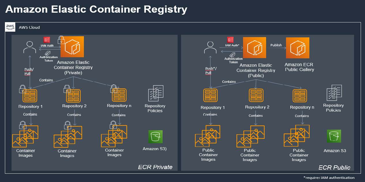 ECR stochează imaginile transparent pentru utilizator în serviciul AWS Simple Cloud Storage (S3). Prin urmare, nu puteți accesa aceste imagini direct din serviciul S3, dar beneficiați indirect de durabilitatea și reziliența oferită de acesta. Din punctul de vedere al securității, transmisia datelor de face criptat și ECR oferă posibilitatea scanării de securitate a imaginilor folosind tehnologia Clair.