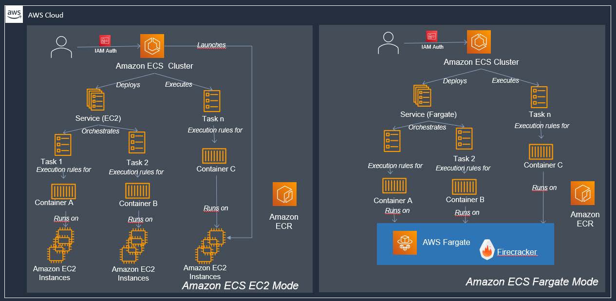 Amazon Elastic Container Service(ECS) este unul dintre serviciile AWS care permite rularea și gestionarea containerelor. La baza acestui serviciu sunt clustere ECS care conțin servicii și sarcini. ECS are două moduri de operare: modul ECS EC2 și modul ECS Fargate. Diferența principală dintre ECS EC2 și ECS Fargate este faptul că ECS EC2 folosește instanțe EC2 gestionate de utilizator, iar ECS Fargate lucrează serverless fără a fi nevoie de gestionarea instanțelor de către utilizator. De ce au ales clienți precum Duolingo, Samsung sau General Electric, rularea de containere în Amazon ECS? Câteva motive ar fi: flexibilitatea dată de modurile de rulare EC2 și Fargate, securitatea, complexitatea relativ scăzută (vom vedea în articolele următoare servicii AWS mai simple), dar și viteza de scalare din Fargate. Performanța Fargate se datorează optimizărilor AWS, dar și tehnologiei Firecraker (dezvoltată și în România). Aceasta este o tehnologie de virtualizare, special creată pentru a rula containere și funcții Lambda în AWS. La baza Firecracker stă concepul de microVM care combină securitatea oferită de mașini virtuale cu viteza oferită de containere.