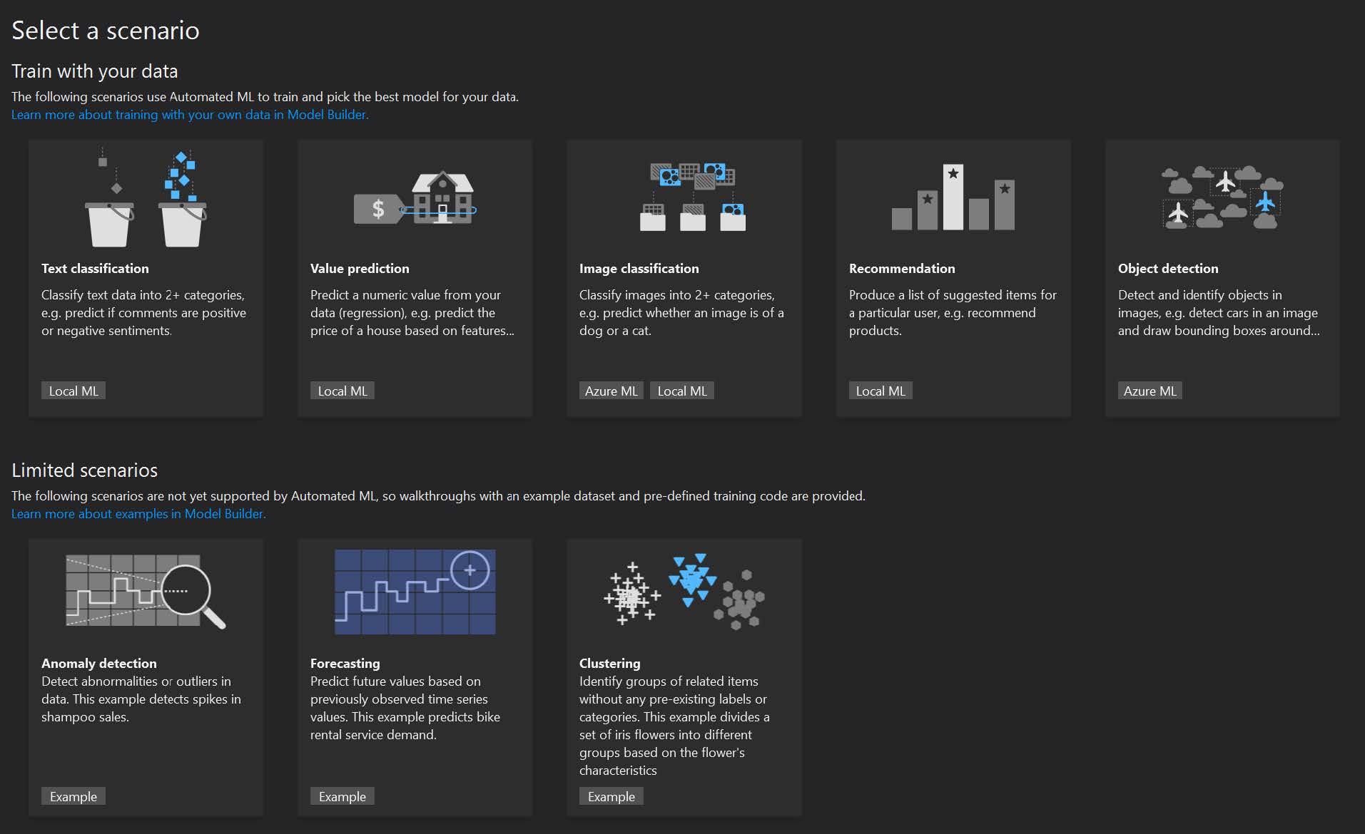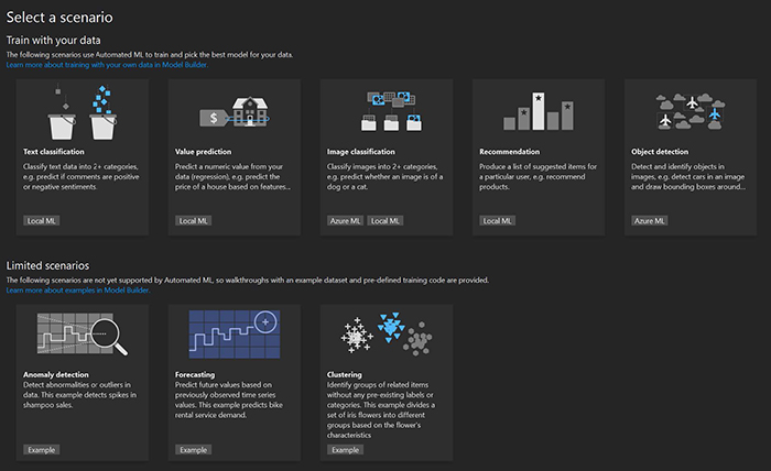 Dacă sunteți Data Scientist, poate doriți să începeți antrenarea modelului de machine learning de la zero. Dacă sunteți un programator software puteți prefera Model Builder, care este un instrument vizual excelent pentru a vă ajuta să creați un model ML.NET pornind de la date. Împreună cu modelul de machine learning, sunt generate modelele de date de intrare și de ieșire și chiar cod boilerplate pentru a antrena și consuma modelul.