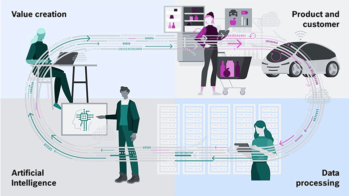 Pe de altă parte, algoritmii IA au nevoie de date din care să învețe, aceștia fiind la fel de buni, precum datele pe care au fost antrenați. Prin urmare, factorul cheie în acest context sunt datele rezultate din utilizarea produselor inteligente, conectate, din interacțiunea dintre oameni și mașini sau din aceea dintre mașini. Conectând internetul lucrurilor cu IA și învățarea automată, putem trage concluzii corecte din acest volum mare de date și putem reacționa la aceste date în termen de câteva secunde, la nivel de procese de inginerie. Învățăm din date și astfel ne putem îmbunătăți produsele și serviciile noastre în permanență.