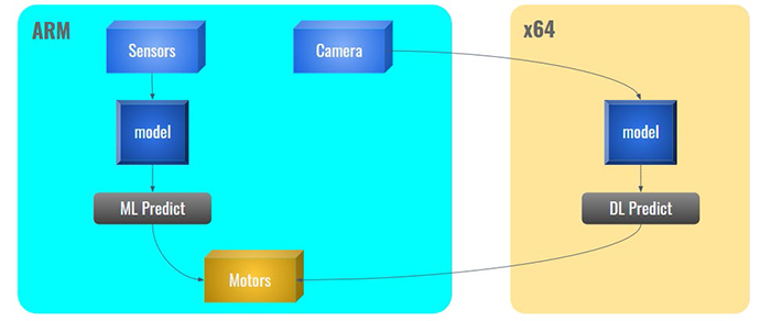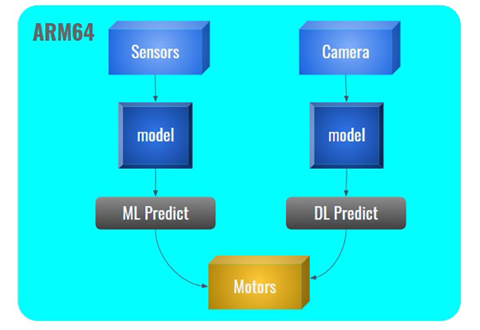 Sper că predicția pentru modelele TensorFlow va fi suportată în curând pe arhitecturile ARM64 și mai târziu și antrenarea modelelor, pentru a implementa un robot autonom cu adevărat (pentru că nu trebuie să ne bazăm pe ajutor extern de la platforme compatibile precum x64!). În acest fel,diagrama va fi mult simplificată, după cum urmează: