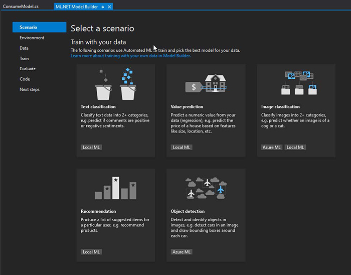 Model Builder - https://dotnet.microsoft.com/apps/machinelearning-ai/ml-dotnet/model-builder