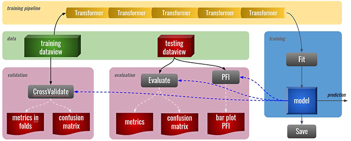 Următoarea imagine arată pipeline-ul de training și unele instrumente, cum ar fi cross-validation, confusion matrix, correlation matrix și permutation feature importance. Acestea sunt folosite pentru a crește calitatea modelului de machine learning.