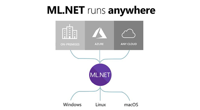 ML.NET este construit pe .NET Core și .NET Standard (moștenind capacitatea de a rula pe Linux, macOS și Windows), fiind conceput ca o platformă extensibilă. Așadar, puteți utiliza modele create cu alte frameworkuri populare (cum ar fi TensorFlow, ONNX, CNTK). ML.NET este un framework on-premise, open-source, cross-platform, bazat pe cod, dezvoltat de Microsoft și comunitatea .NET.