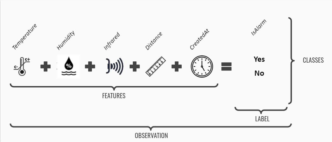 Observațiile din setul de date sunt etichetate, ceea ce înseamnă că avem o observație țintă (target feature) numită "IsAlarm" pentru fiecare observație din setul de date.