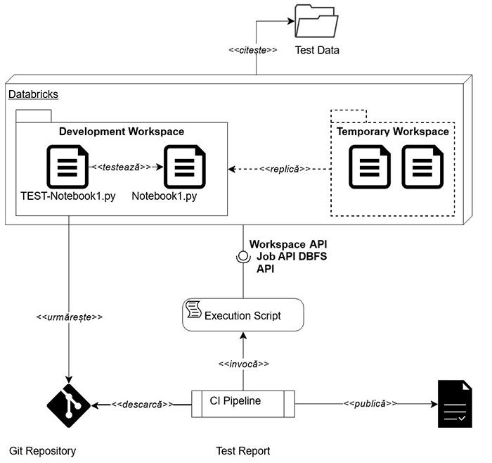Databricks oferă Development Workspace pentru implementarea Testelor de Integrare și execuția lor automată ulterioară, într-un Temporary Workspace al cărui ciclu de viață este gestionat în întregime prin intermediul Databricks Workspace API.