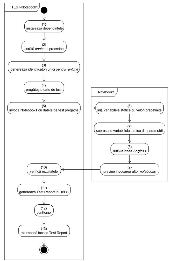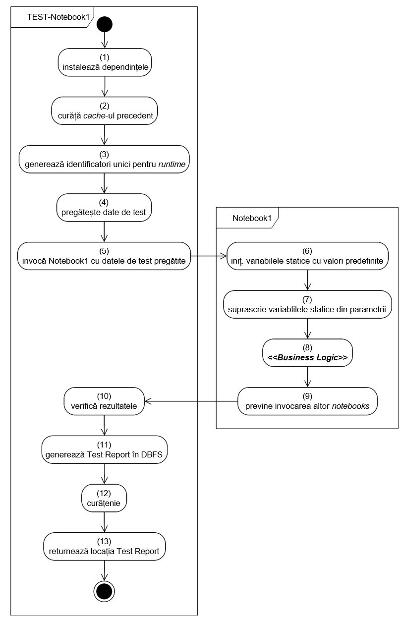 În acest articol considerăm că Notebook1 este codul țintă, iar TEST-Notebook1 își propune să îl testeze. Următoarea diagramă prezintă activitățile din cadrul celor două nootebookuri.