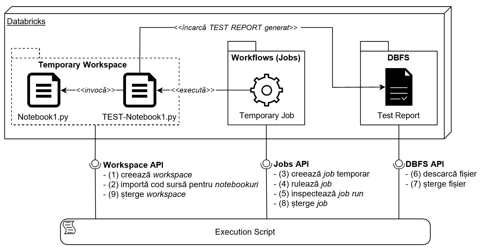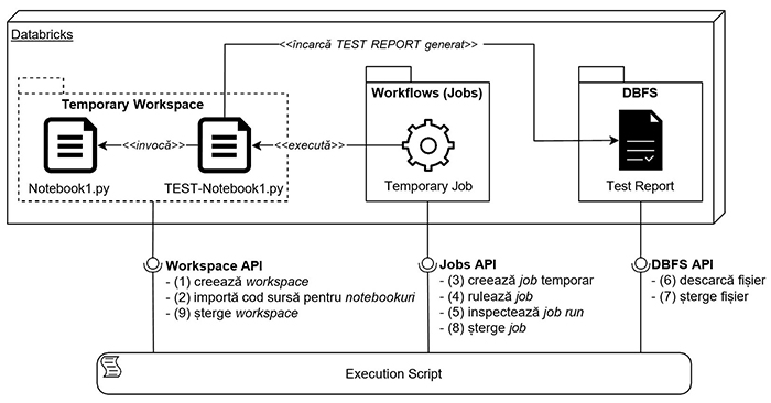 Prin folosirea Workspace API, scriptul creează un spațiu de lucru temporar cu Pasul (1) și încarcă toate notebookurile din codul lor sursă (inclusiv fișierele TEST-) cu Pasul (2).